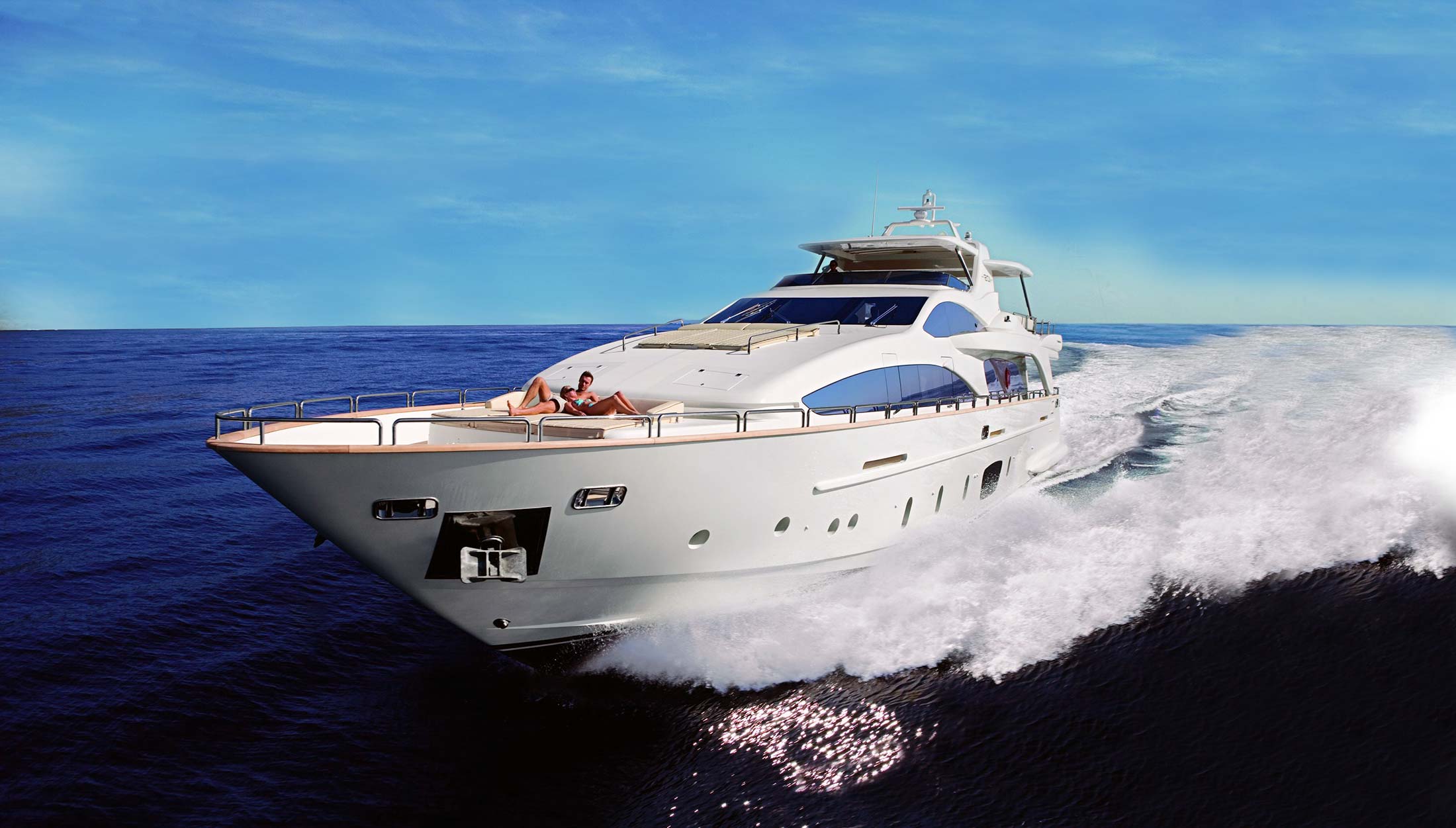 - Bow area with two sun pads and access from walk-around side decks or two wing doors